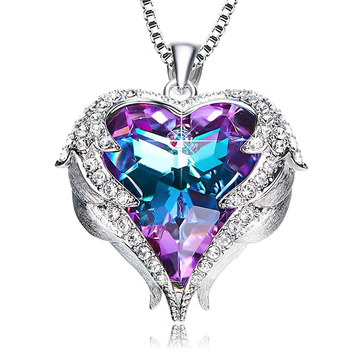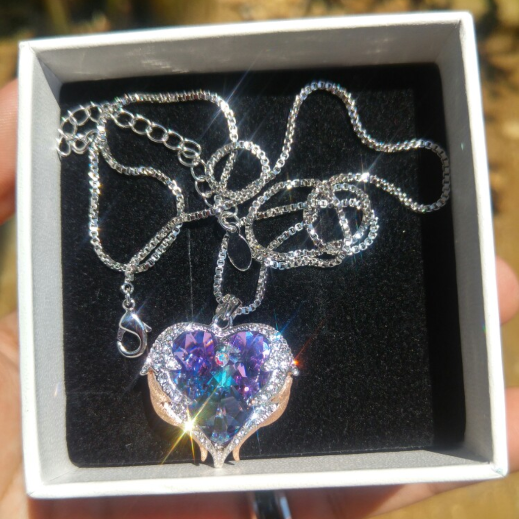 O Colar é produzido em aço inoxidável, não desbota e não perde a cor. O pingente é envolvido com uma asa de anjo cravejada com pedras de zircônia e com um lindo cristal swarovski com tons de azul e violeta.